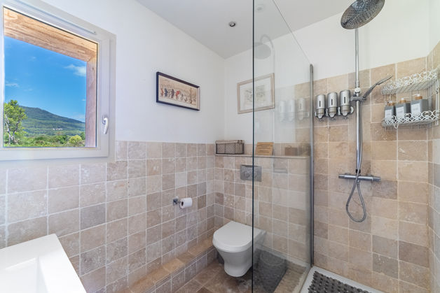 This south facing bedroom with comfortable king size bed (which can be separated into two single beds) has an extra pull-out bed and wash basin. It shares the shower room and loo with bedroom LES OLIVIERS and has air-conditioning.